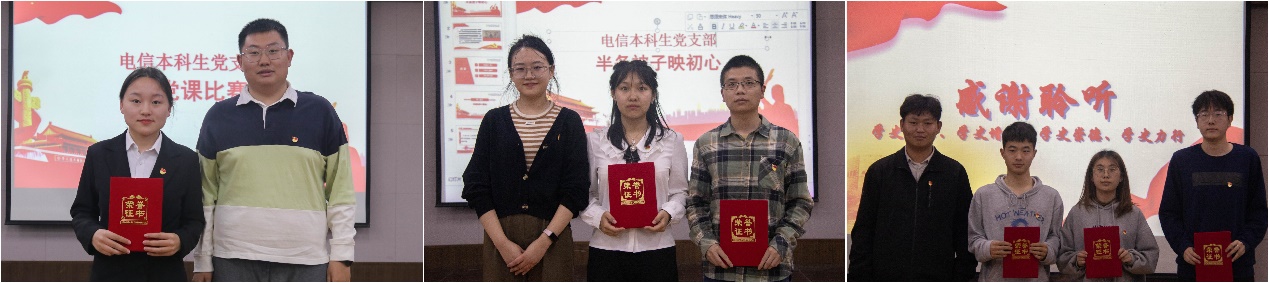 经过激烈的角逐,姚赛赛组的《太行山上的新“愚公”》获得一等奖;王亚男组的《大漠深处的坚守》、董思意组的《半床被子映初心》获得二等奖;王鹤颖组《张桂梅:山里的孩子一个都不能掉队》、王勇杰组的《奋斗二十大,共圆脱贫梦》、高铭远组的《路生梅:为群众扎根黄土高原》获得三等奖。支部书记伍景涛对党课质量给予高度评价,他指出,本次比赛内涵丰富、内容殷实、形式多样,党课主讲人以“小选题”讲出“大内涵”,用“身边人”讲述“身边事”,从“新视角”讲透“老道理”,充满激情的表达令人印象深刻,为大家呈现了一场微党课盛筵,他希望同学们能够传承红色基因,勇担时代大任,身体力行地学习贯彻党的二十大精神。