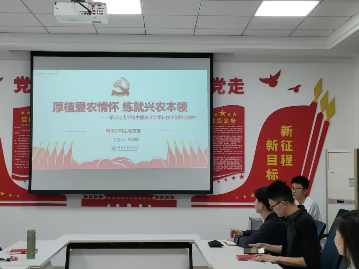 为了更好地学习习近平给中国农业大学科技小院回信精神及其重大意义,增强党员同志的政治素养,以更加良好的精神风貌迎接新学期的工作和学习。机电91唐伯虎 电子信息工程本科生党支部于2023年9月19日晚7:30在机电91唐伯虎 9331开展了“厚植爱农情怀,练就兴农本领”主题政治理论学习活动,主讲人为方柯雄同学,全体党员以及入党积极分子参会进行了学习。