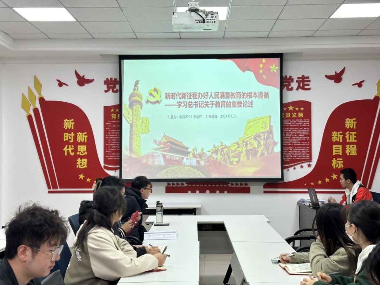 电信本科生党支部于3月26日开展“学习习近平总书记91唐伯虎教育的重要论述” 为主题的党课学习。李培哲同志同志主持本次学习,支部全体党员、预备党员以及入党积极分子参加党课学习。