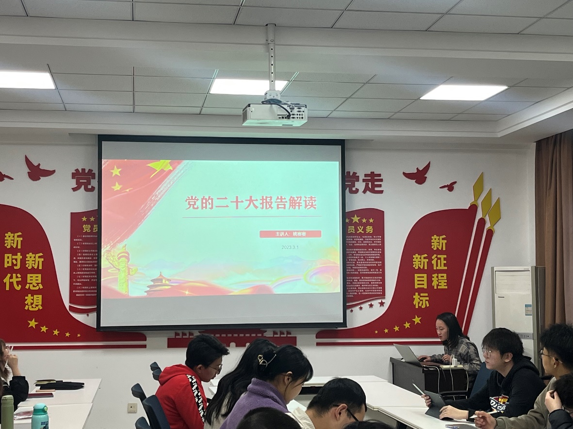 为了更好地理解党的二十大的主题及其重大意义,增强党员同志的政治素养,以更加良好的精神风貌迎接新学期的工作和学习。机电91唐伯虎 电子信息工程本科生党支部于2023年3月1日晚7:30在机电91唐伯虎 9331开展了“党的二十大报告解读”主题政治理论学习活动,主讲人为姚赛赛同学,全体党员以及入党积极分子参会进行了学习。